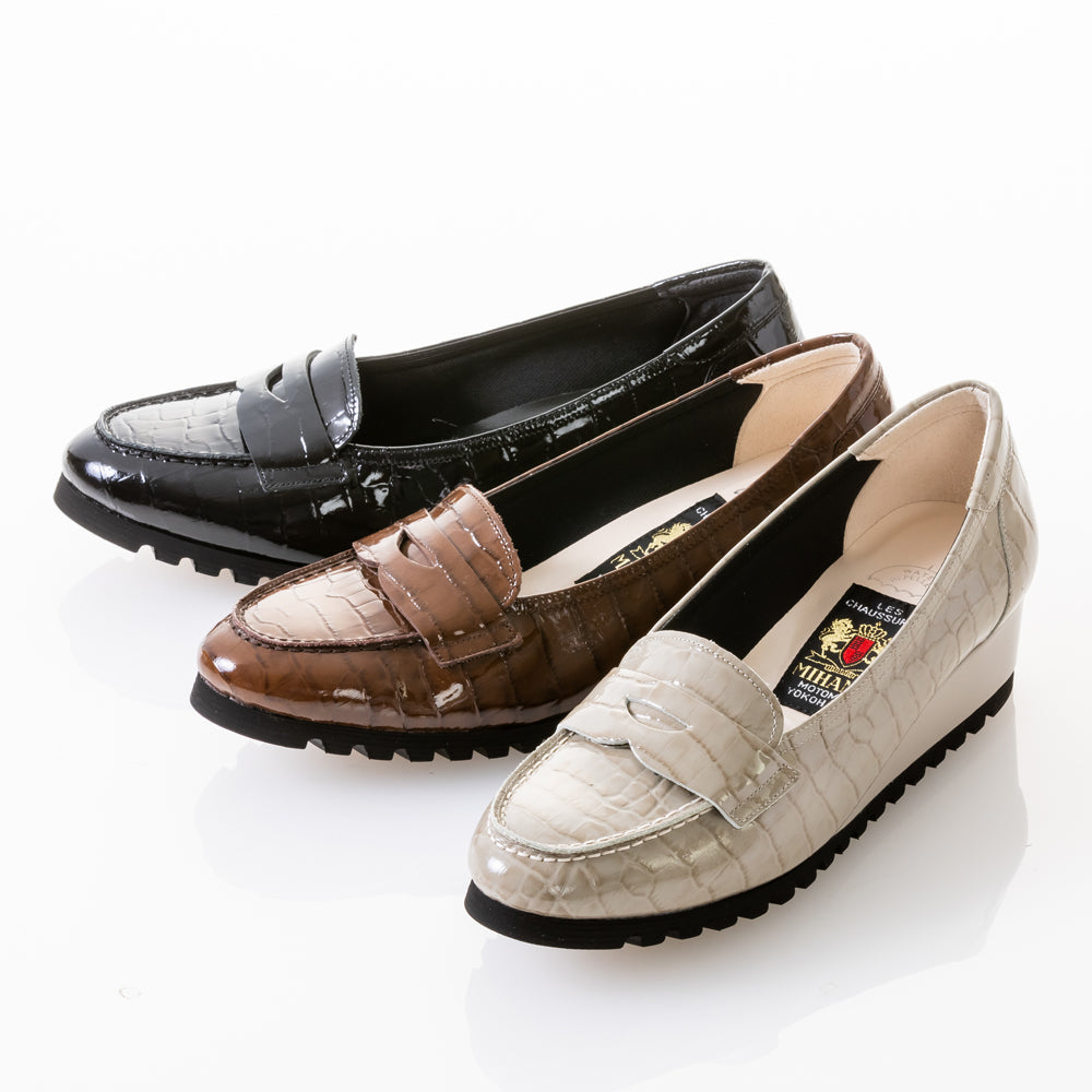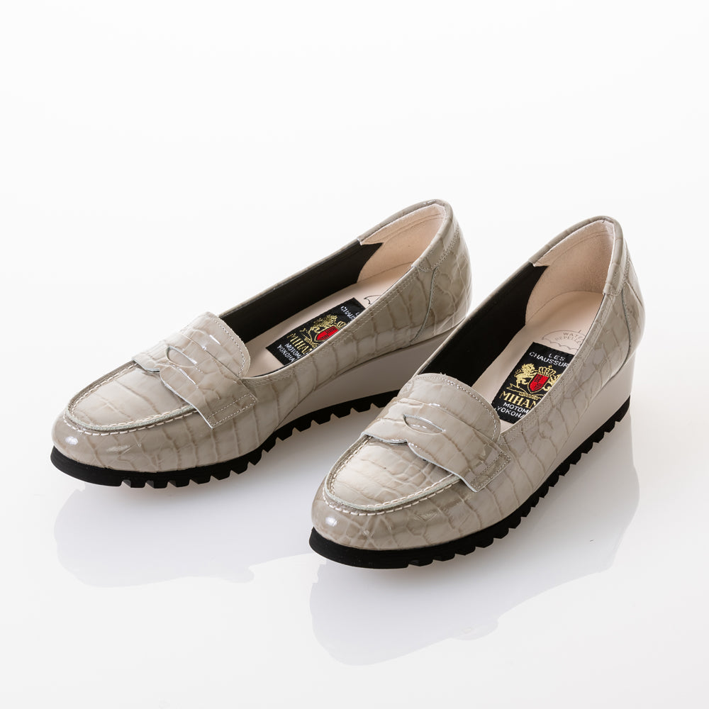 軽く安定感のあるウェッジソールは履きやすさを、ソフトエナメルレザーのボディは