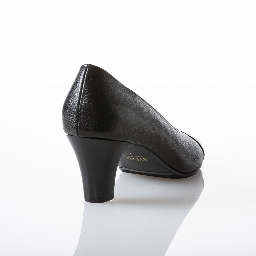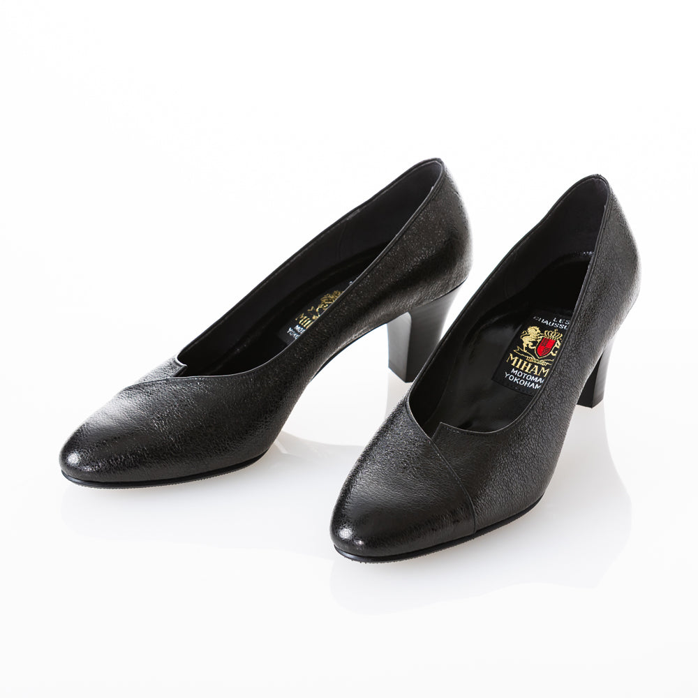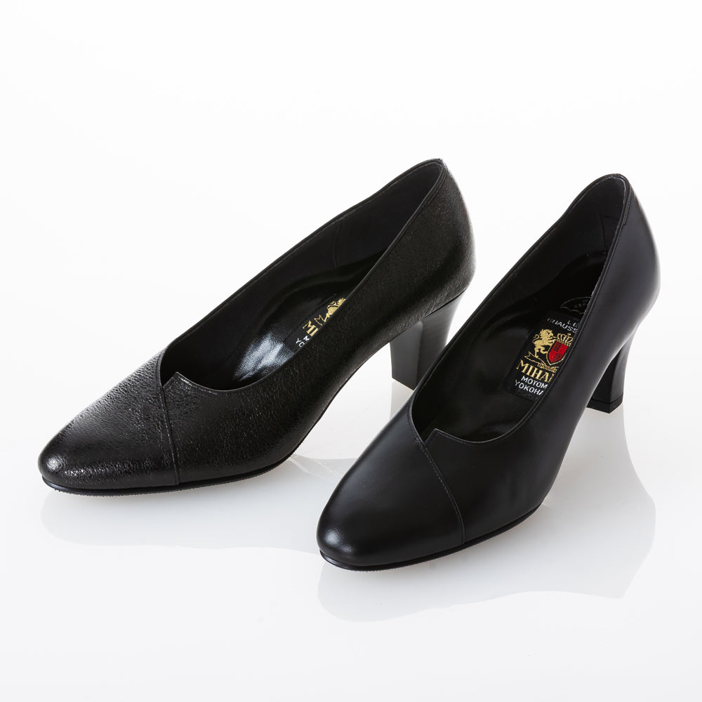 マットな質感のブラックレザーにさり気ない切替デザインで、足元をすっきり綺麗に見せてくれる6cmヒールパンプス。